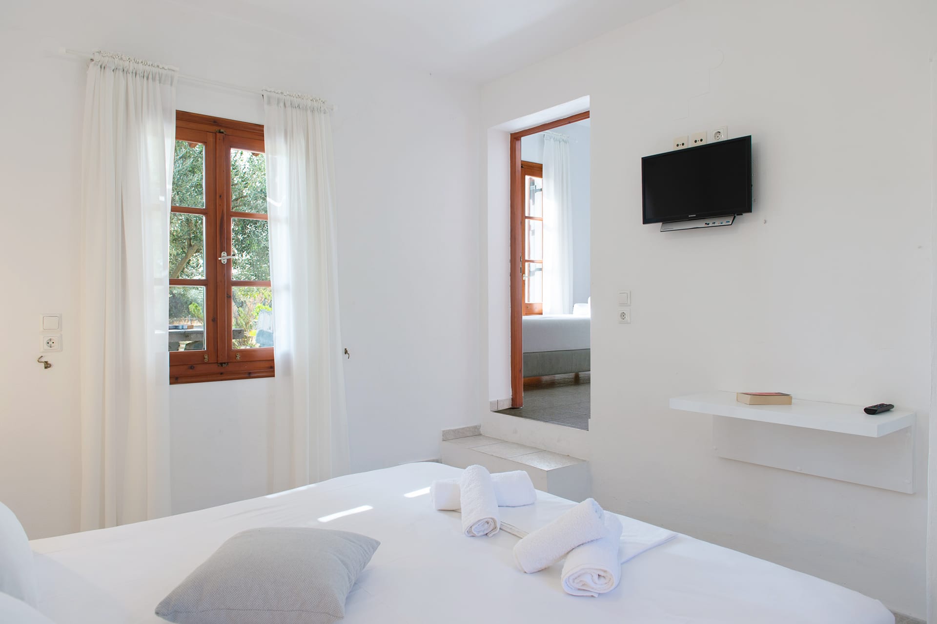 The Grand Room at Blue Fish in Platis Gialos is a spacious and welcoming apartment designed for up to three adults, blending Cycladic charm with practical comforts for a relaxed holiday on Sifnos. Set within a peaceful estate of olive trees just a short stroll from Platis Gialos Beach, the apartment offers generous living space with comfortable bedding, a separate seating area, and modern touches throughout. Guests enjoy thoughtful amenities including air conditioning, free Wi-Fi, and a private bathroom with a walk-in shower and complimentary toiletries. A kitchenette or kitchen area comes equipped with a refrigerator, coffee/tea maker, cooktop and dining space, making it ideal for self-catering breakfasts or casual meals. Step outside onto your own balcony or terrace, furnished with outdoor seating where you can sip morning coffee or unwind with a drink while taking in peaceful views of the garden and surrounding Aegean landscape. With its mix of space, convenience, and proximity to sandy beaches, local tavernas, and cafés, the Grand Room apartment provides a comfortable base for couples, friends, or small families exploring Sifnos.